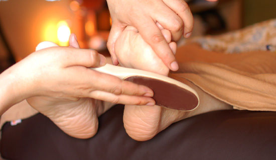 足裏の反射区をほぐし、オイルでふくらはぎを流します。